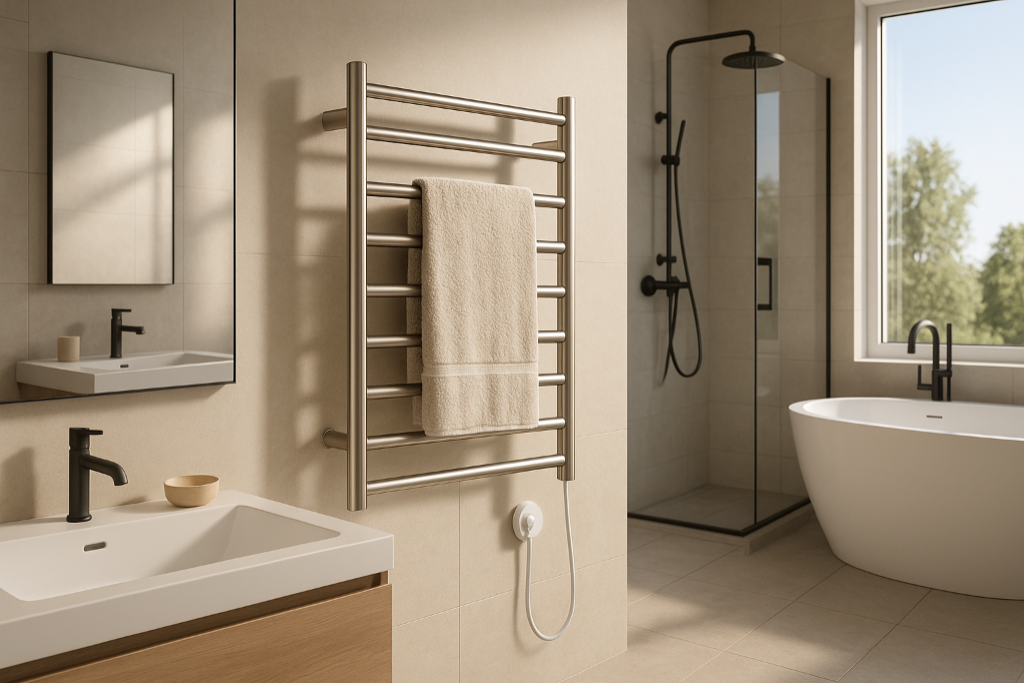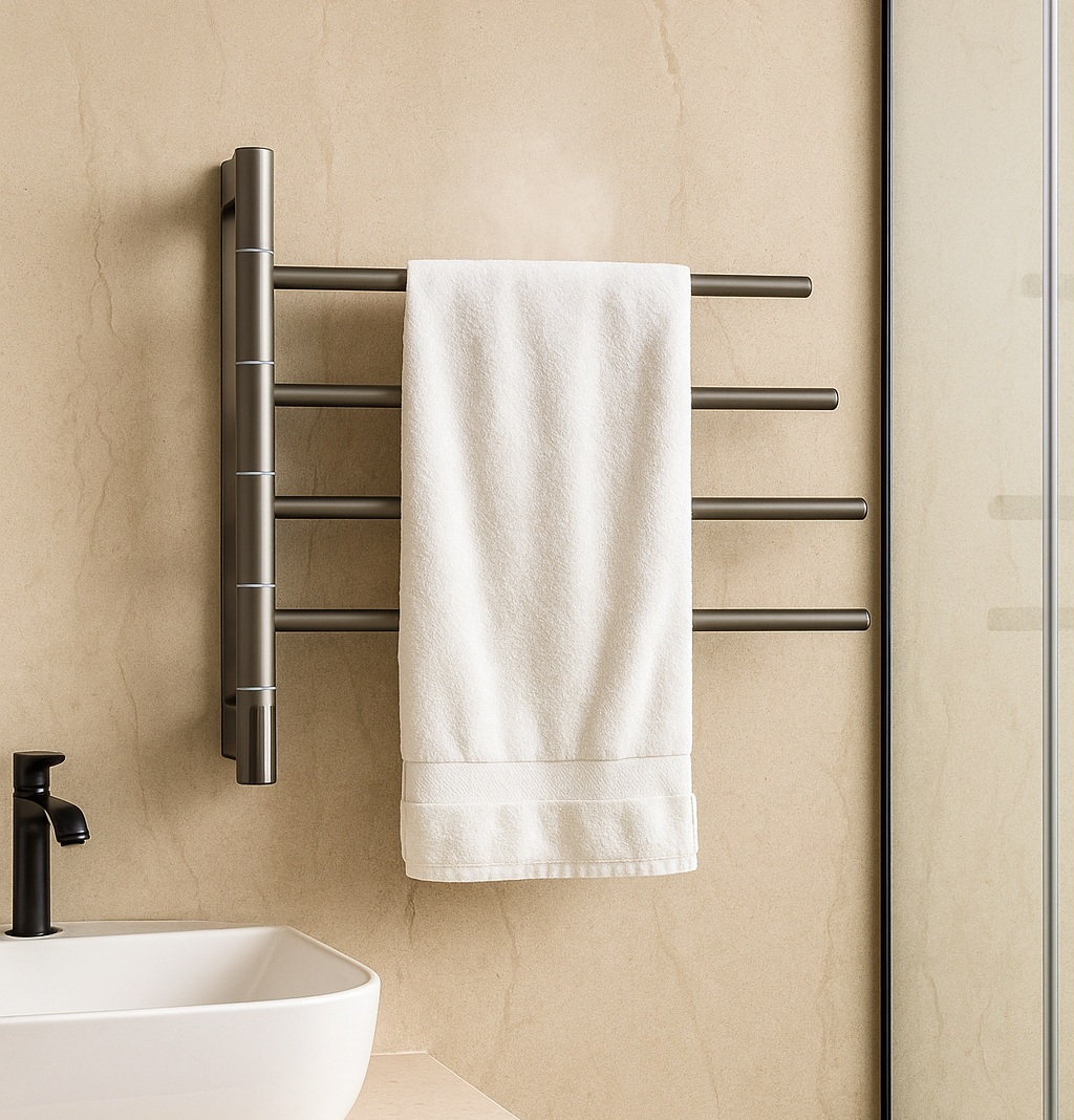 電熱毛巾架透過內部加熱元件,將管身溫度控制在約45℃~60℃之間。既能快速蒸發水分,又能確保不會燙傷織物或皮膚。